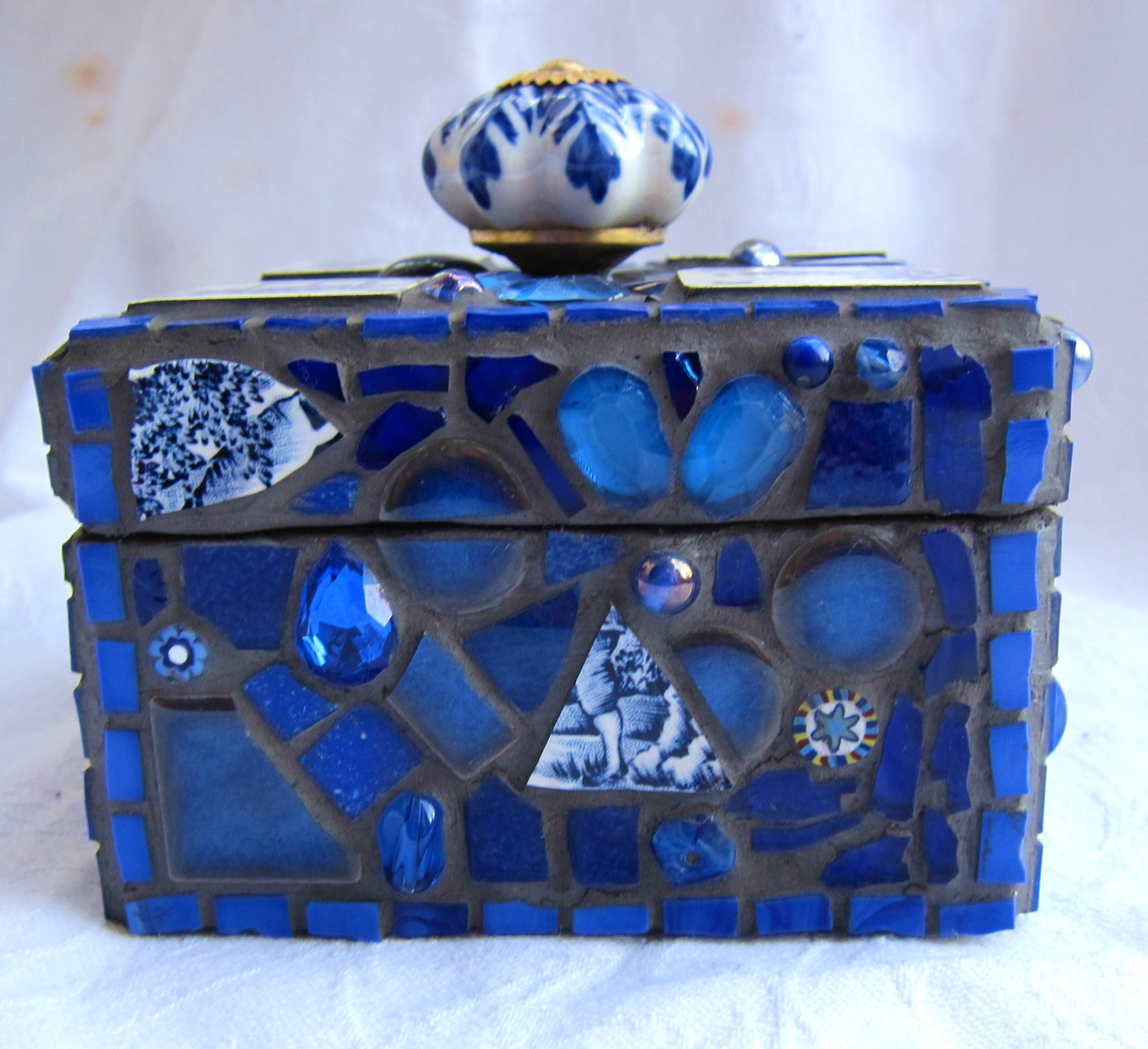 I got the cool knob and the corner tiles from a flea market in Amsterdam. The surrounding areas are covered in all kinds of blue tess: nuggets, mille, shards, glass, flowers, beads...