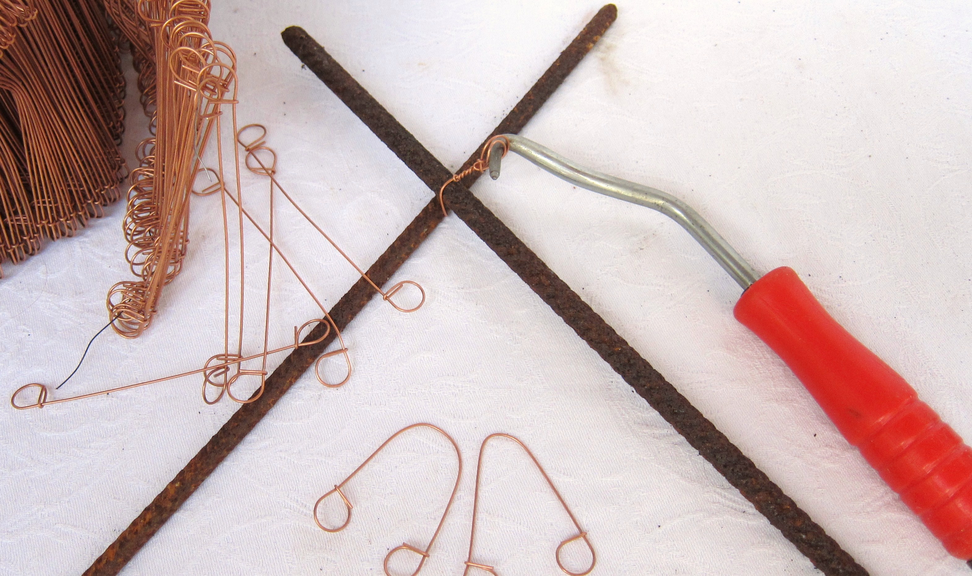 And this is how I attached the rebar and chicken wire. These are short lengths of copper wire with small loops at each end. You bend the wire over and round whatever you want to attach, insert the point of the orange tool into both loops, and then twist them together until the wire is pulled tight.