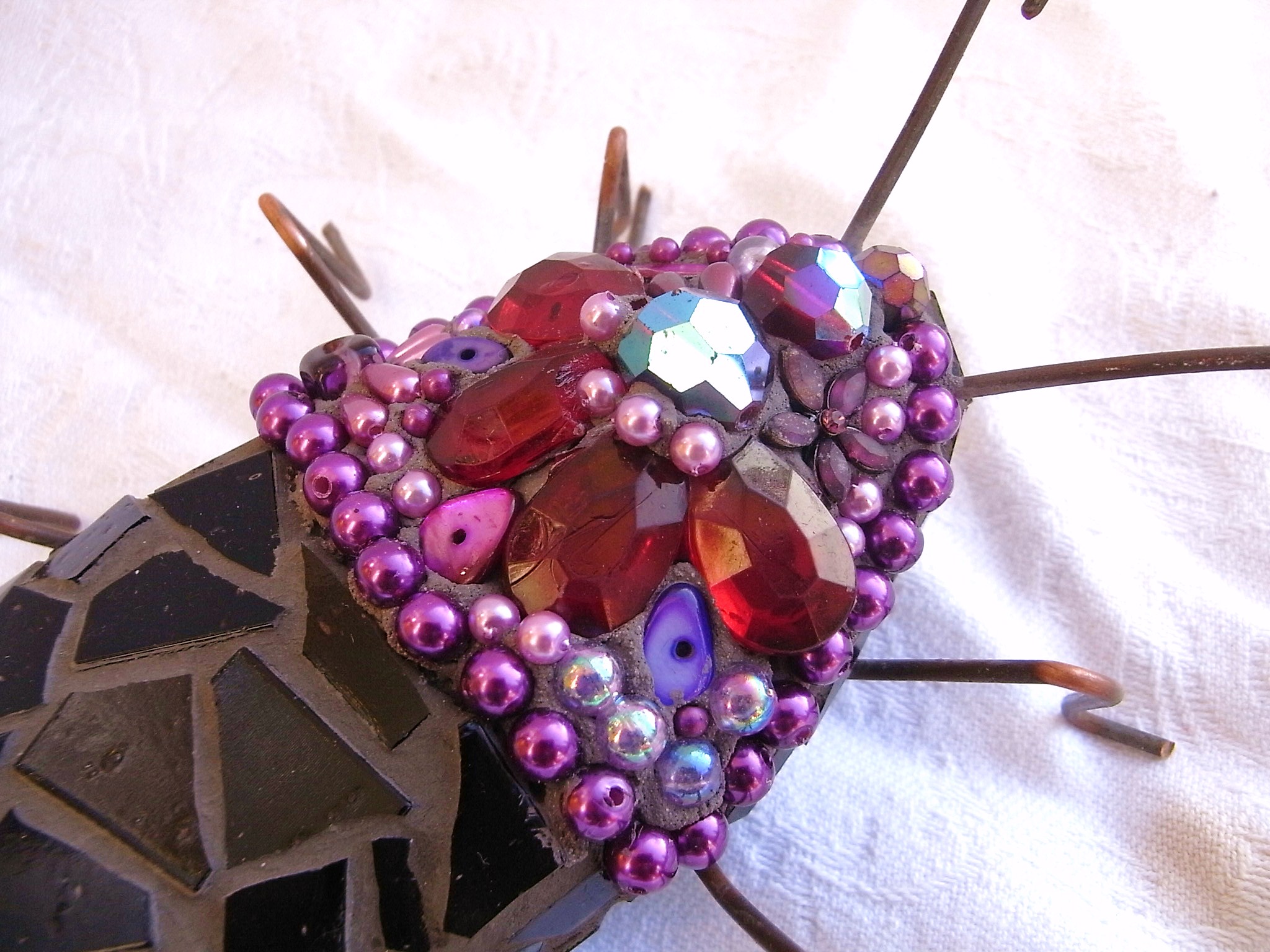 Handcarved aerated concrete base, copper legs and antenae and glass mosaic body with added beads, glitter and jewels . Measures about 15 cm from head to toe.